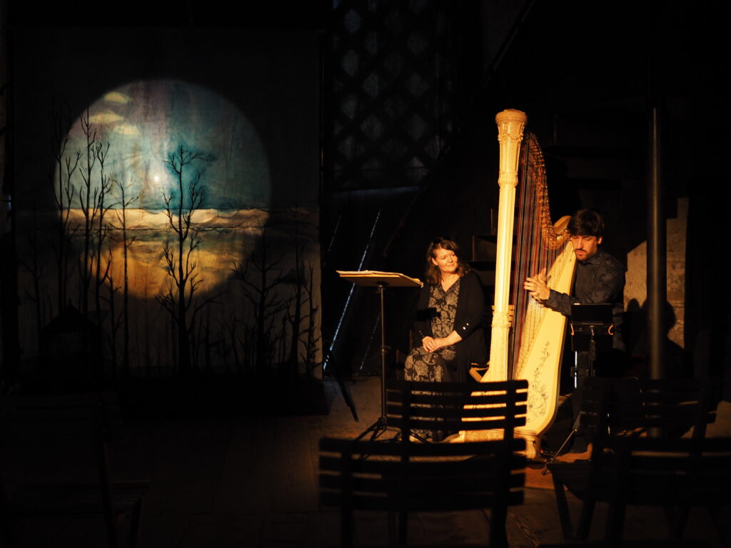 Die Lieder der Melodie Francaise (Gabriel Faure, Rynaldo Hahn, Ernest Chausson und Jules Massenet) werden von einer Harfe begleitet und wie ein Bilderbuch mit buntem Schattenspiel auf die Bühne gebracht. Parallel dazu entspinnt sich die Geschichte der zwei Figuren (Marionetten) Colombine und Pulcinella, die sich als Liebespärchen begegnen.